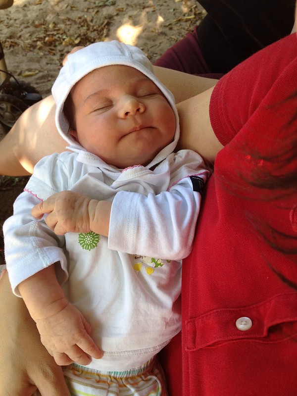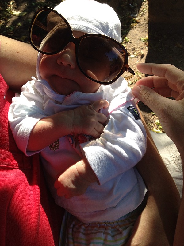 Ist klar dass man da nicht einfach so aus dem Haus kann, Sonnenbrille ist Pflicht! Und so lies es sich im Schatten, in Mamas Armen, dann doch noch gut schlafen!