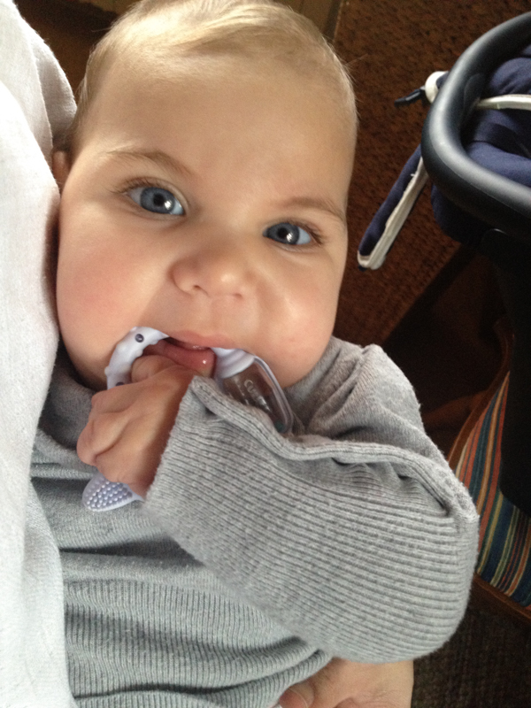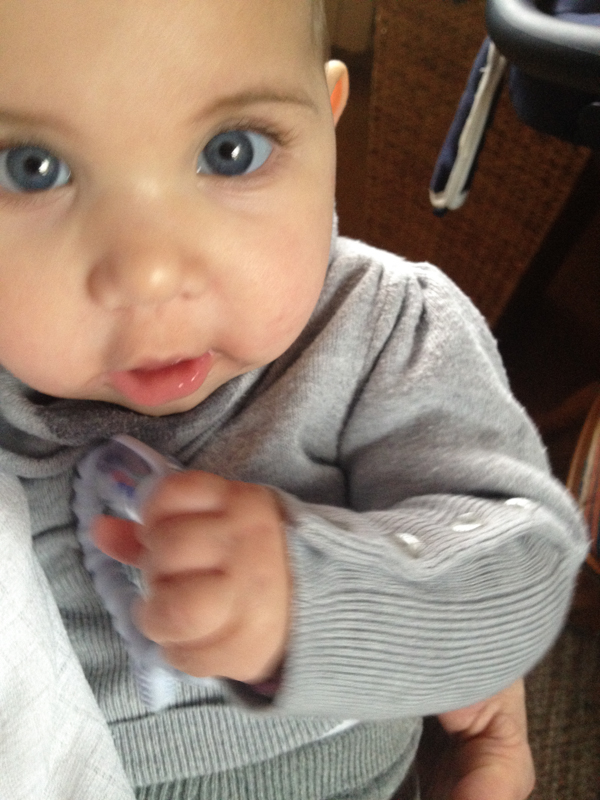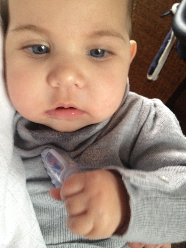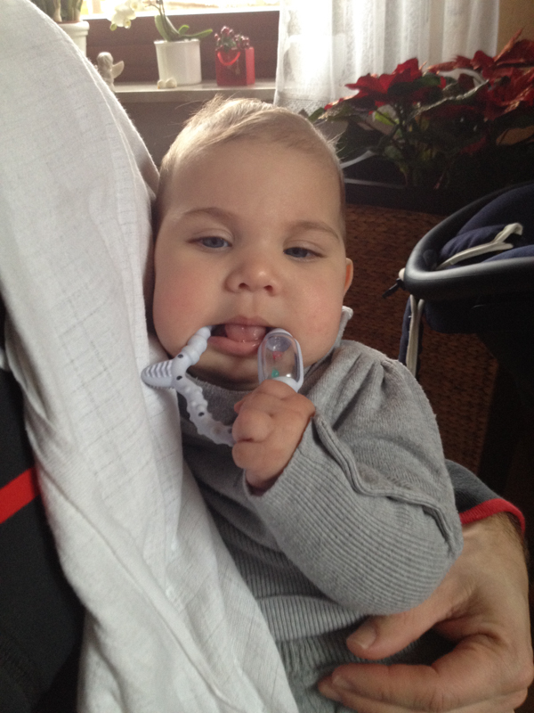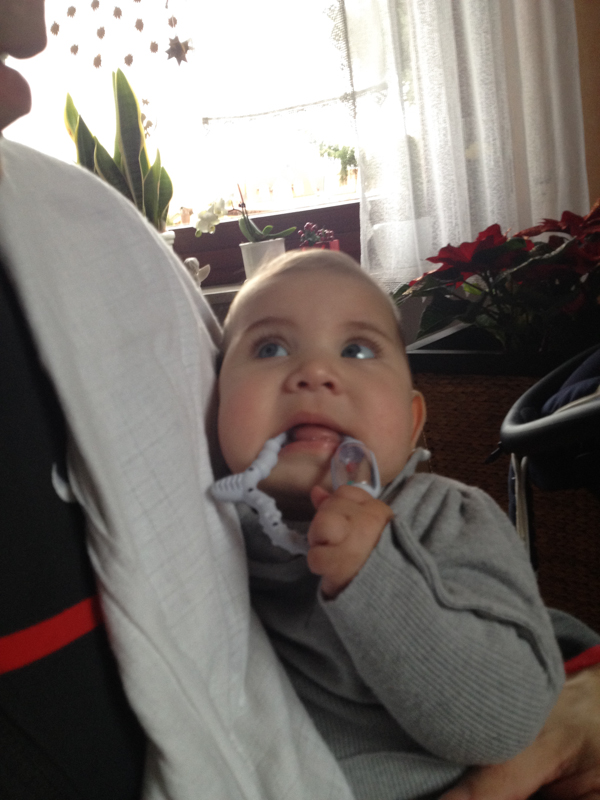 Nachdem ich am 17.12 zum ersten mal 39,2 Fieber hatte, hat die Mama am 23.12 entdeckt dass mein erster Zahn kommt. Und zwar unten rechts der vordere Zahn kommt. Ich hatte ja die ganze Zeit der Mama versucht zu sagen, dass das Fieber vom Zahn her rührte, aber manchmal hören Erwachsene einfach nicht. Stattdessen waren wir nochmal beim Arzt um zu kontrollieren dass ich keine Erkältung habe und diese sich nicht auf die Lunge absetzt. Naja nun schlucke ich eben Globuli gegen Erkältung und habe immernoch Zahnweh.